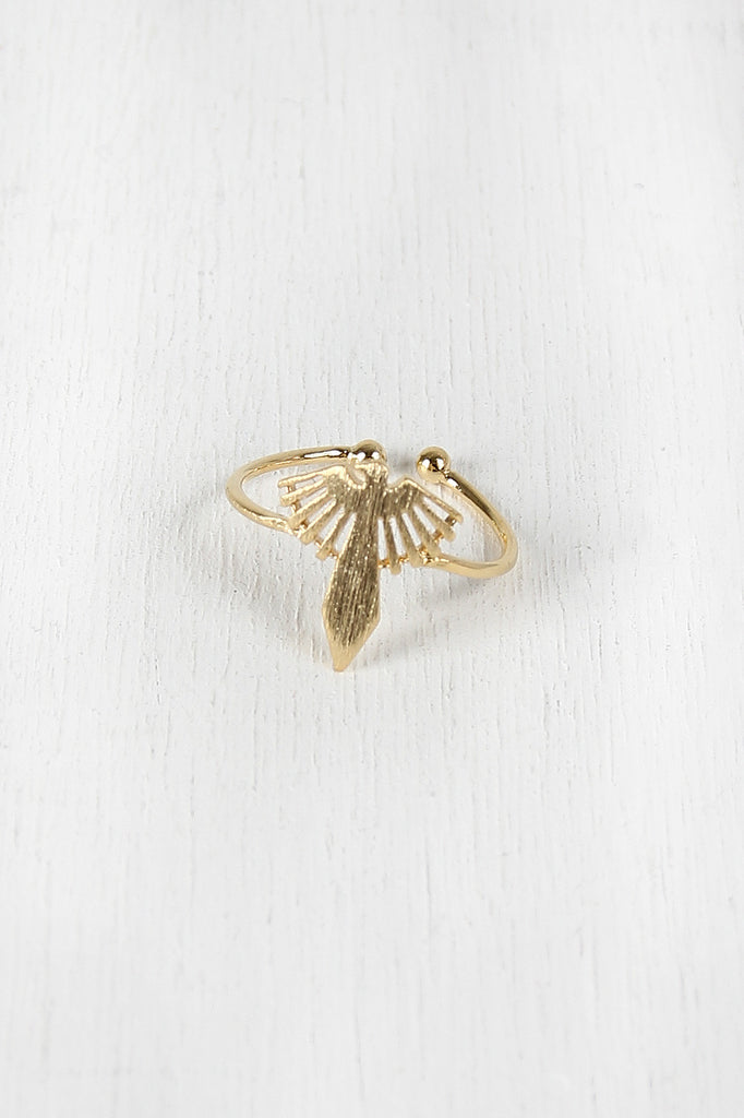 This open-ended ring features a tribal bird design with brushed metal texture on glossy band.