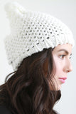 A loose knit beanie featuring solid coloring, pom pom top, and a chevron-patterned elastic opening.