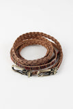 This belt set features a braided faux suede belt and an adjustable multi color striped belt backed with vegan leather.