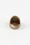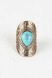 A wide armor ring with a drop-shape faux turquoise stone center and stylized floral designs in glossy enamel.