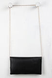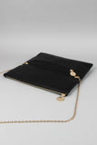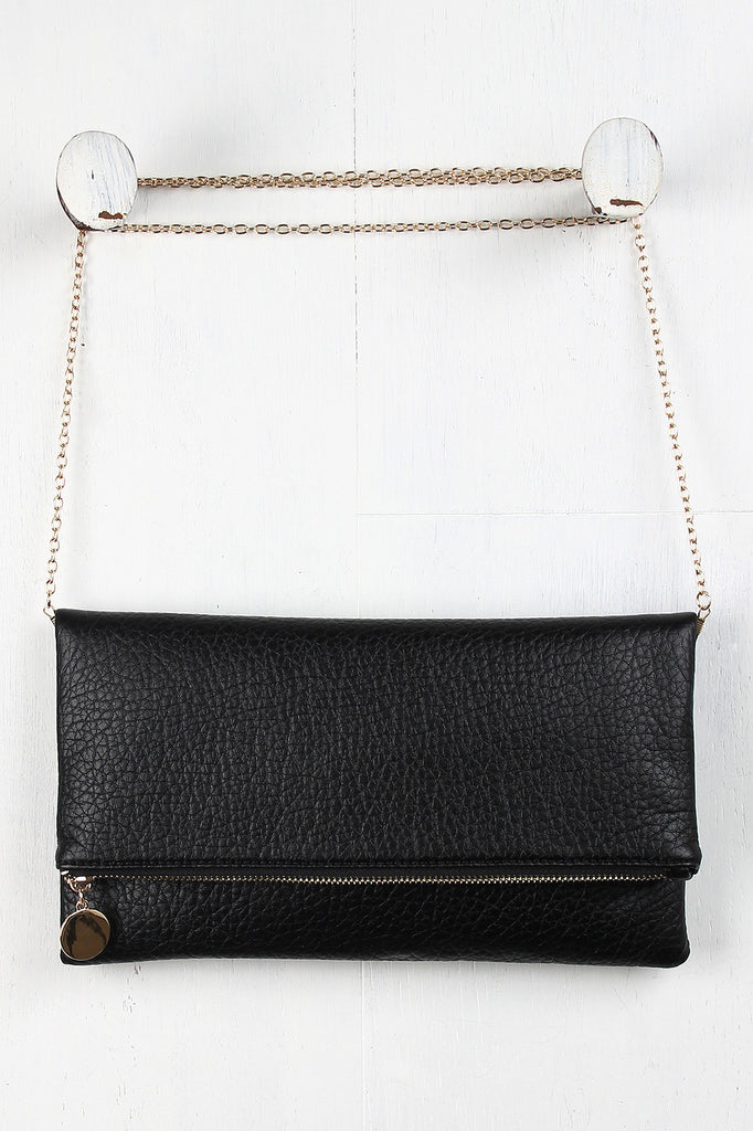 This chic clutch bag features a top zipper with magnetic flap closure, one zipper pocket underneath the flap, lined interior with one zipper pocket, and detachable shoulder chain strap. Shoulder strap has 21.5" Drop.