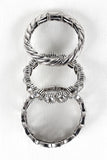 This bracelet features a set of three texture designs, elasticized construction, and rhinestone accents.