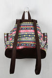 This backpack features tribal pattern canvas main with vegan leather straps and trim. Exterior features three zip closure pockets, magnetic button closure, and drawstring. Interior features magnetic snap button, one zipper pocket, two open pockets, and lining. Bag is finished with adjustable backpack straps and top handle (3" drop).