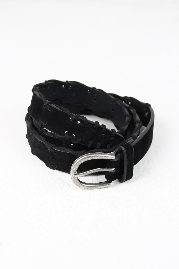 This belt features vegan suede, stitched design, and adjustable closure.
