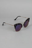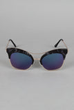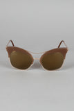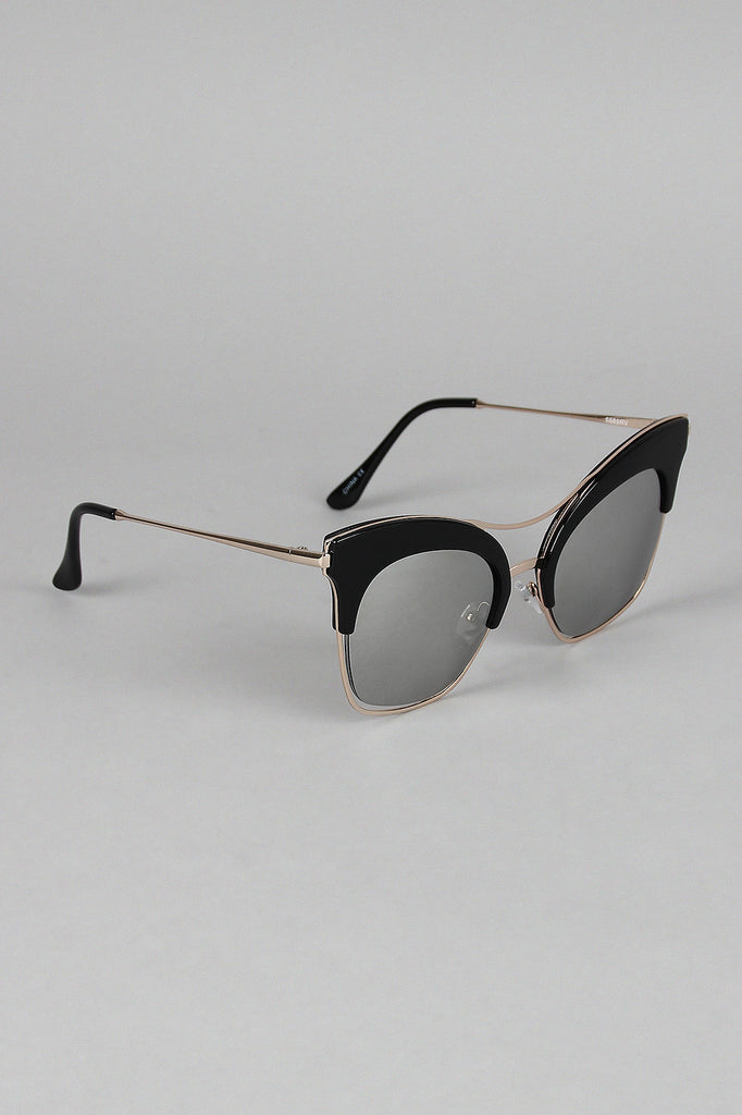 These sunglasses feature semi-rimless cat eye frame, metallic trim, double bridge, and nose cushions.