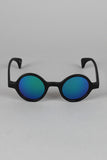 These sunglasses feature matte horn rim style frame, round mirrored lenses, and single nose bridge.