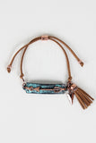 This bracelet features a vegan leather cord, metal plate with decorative arrow, vegan leather tassel, arrow head charm and an adjustable pull string closure.