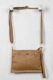 This quirky clutch features textured vegan leather pants design, complete with two functional back pockets, and top zipper closure. Interior features single zipper pocket and full lining. Bag is finished with removable wrist strap and removable adjustable shoulder strap (17" drop).