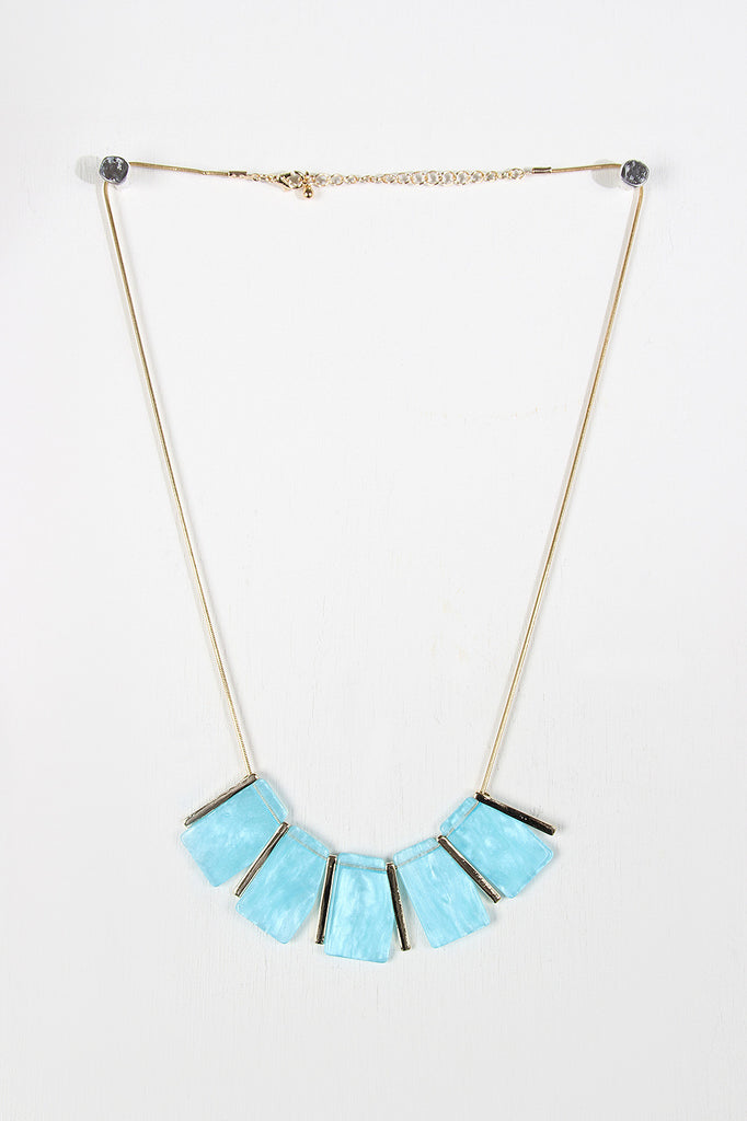 This statement necklace features a multiple irregular shaped turquoise gemstones with faux gold bars accent. Finished with an adjustable lobster hook closure.