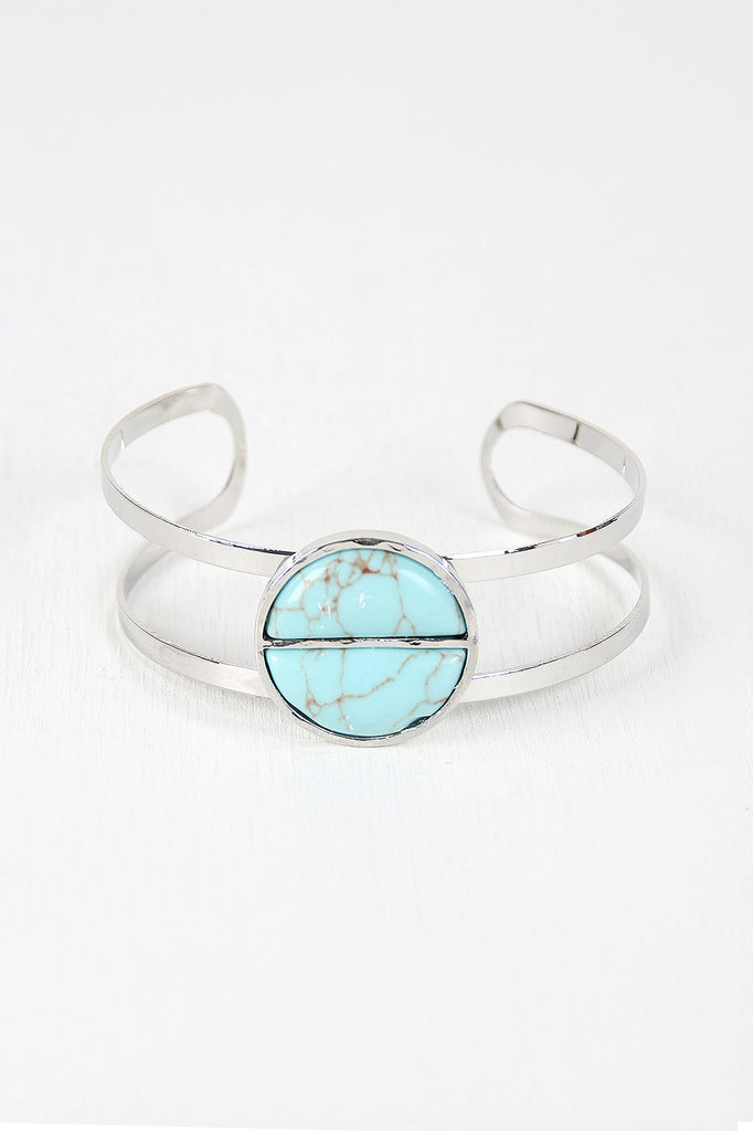 This cute cuff bracelet features high-polish metallic frame, cut out design, divided marbled stone, and open ends for easy on/off.