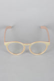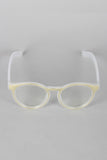 These glasses feature horn rim style plastic frame, round clear lenses, and front metallic accent.