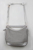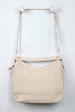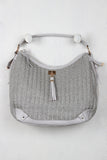 This stylish handbag features woven straw material, contrast vegan leather, large tassel embellishment, side zippers, and top zipper closure. Interior features pockets and full lining. Bag is finished with top handle (8" drop) and removable adjustable shoulder strap (22" drop).