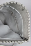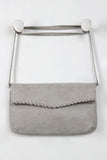This clutch bag features weathered-look vegan leather, stitched front flap, and snap button closure. Interior features zipper pocket and full lining. Bag is finished with shoulder strap (21" drop).