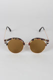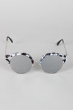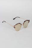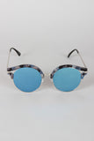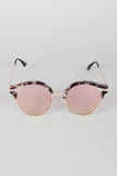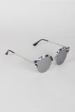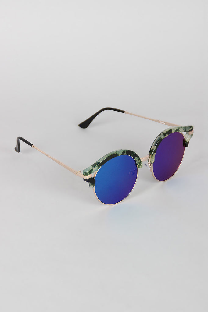 These stylish sunglasses feature a plastic marble design, cats eye with cutout, wire rimed, high polished metal finish, and single bridge with nose cushions.