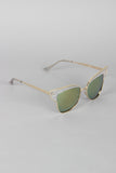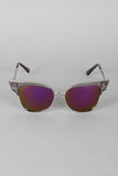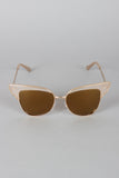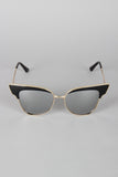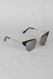 These sunglasses feature a butterfly wing silhouette design, metallic bridge and frame, and nose cushions.
