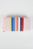This cute wallet features a vegan leather with a simple multi colored stripe pattern printed on it, three side zipper, one inner zipper pouch, eight card slots and three sections.