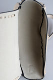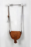 This simple mini-bag features vegan leather, front flap with stitching detail and two tassels, magnetic clasp closure, and adjustable buckle shoulder strap (21.5" drop).