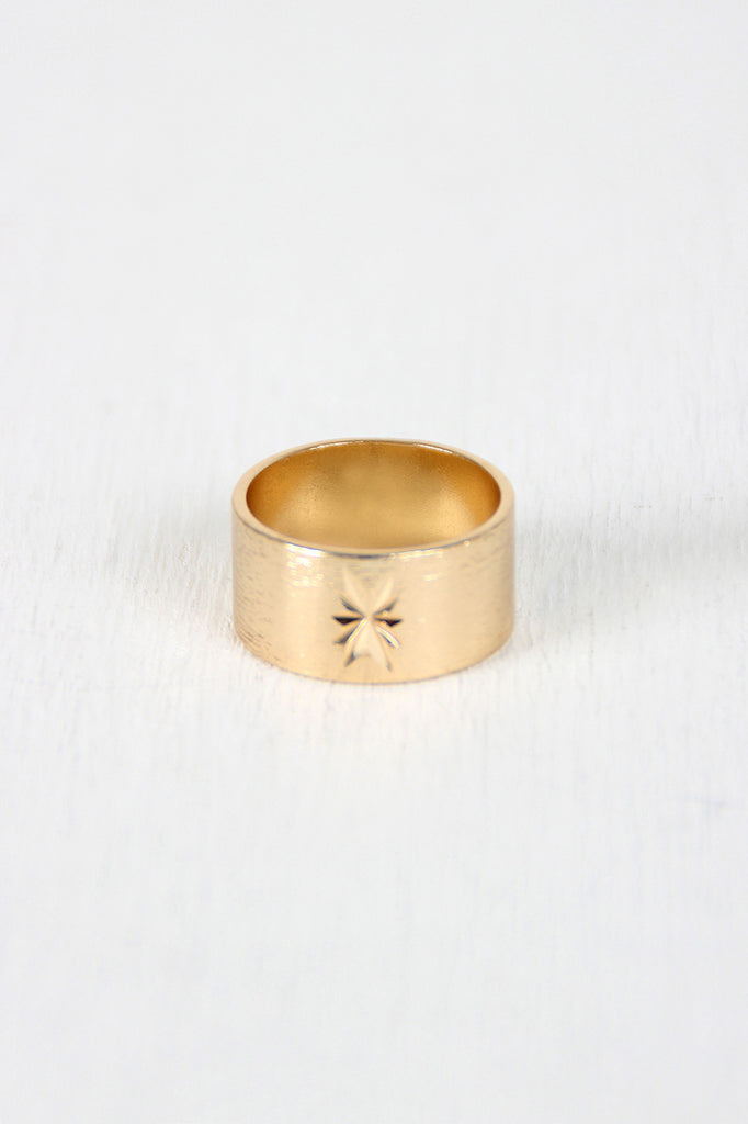 This ring features a wide band with the north star etched on it, and finished with a textured high-polished gold-tone frame. Non-adjustable.