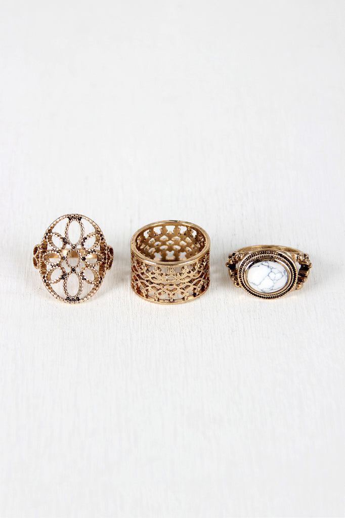 This ring set features three different bands, One floral cutout detail band, one wide band with mirroring crown cutout, and one with faux turquoise stone. Non-adjustable.