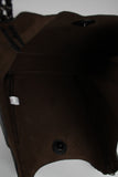 This trapeze style tote bag features pebbled vegan leather with woven chain accent, top middle scoop design, snap button closure, and top handles (10" drop). Bag comes with matching pouch.