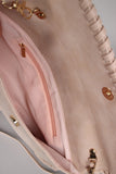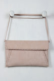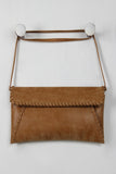 This envelope bag features weathered-look vegan leather, stitching accents, and front flap with snap button closure. Interior features single zipper pocket and full lining. Bag is finished with removable shoulder strap (21.5" drop).