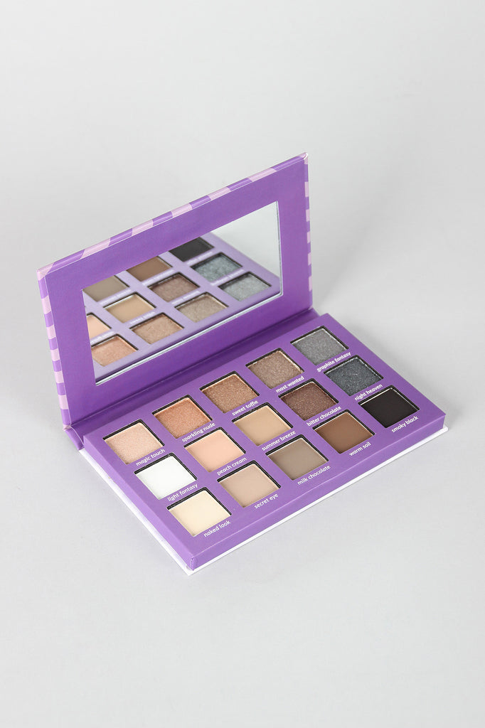 Eyeshadow palette featuring 12 taupe-and-grey-hued neutral shades.