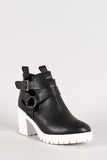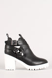 Featuring leatherette upper, round toe, side cut outs, strappy design with single adjustable buckle closure, lug sole platform and chunky flat heel. Finished with stitching detail and cushioned insole for comfort.