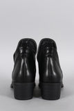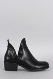 This ankle bootie features a leatherette upper with side cutout for added style, round toe silhouette, stacked bock heel, and cushioned insole for comfort.