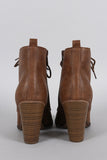This combat style inspired bootie has a lace up tie closure and a side zipper for easy on-off wear. Features a stacked chunky heel. Finished with stitching detail.