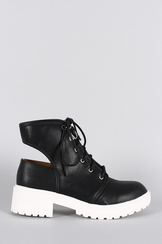 These fashionable booties feature a round toe silhouette, back cutout detail, lug sole, and stitching accents. Finished with low heel, cushioned insole, and lace up closure.