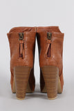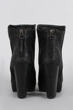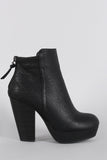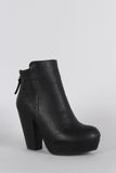 These 70s inspired round toe ankle boots are lifted on a platform and stacked heel. Designed with raised seams and criss-cross stitching along the rear back for an eye catching appeal. Finished with a back zipper for easy on-off wear and a small tassel.