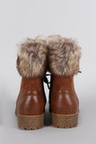 These self-tie booties feature a faux fur cuff. Constructed with a faux suede shaft, featuring an inner side zipper for easy on-off wear. Finished with a classic lug sole.