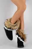 These cozy boots feature a tri-tone asymmetrical faux fur collar design, round toe silhouette, and low flat heel. Finished with cushioned insole, soft faux fur interior lining, and easy pull on style.