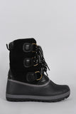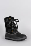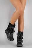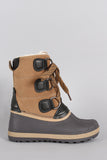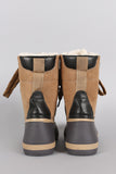 These duck ankle boots feature a combination of vegan suede/PVC upper, stitching accents, lace up front with D-ring decor, pull on tab, and low heel. Finished with cushioned insole and faux fur interior lining for comfort.