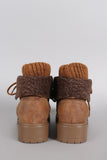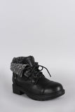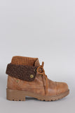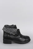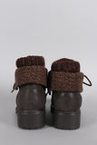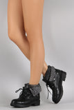These ankle boots are combat style silhouette; featuring, a cap toe, lace up design, and a lug sole. Finished with a faux shearling cuff and light faux fur lining.