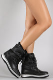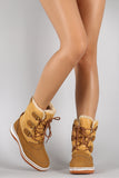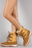 These cozy boots feature a warm faux shearling interior lining, round toe with decorative ridges across the front, top stitching accents, cushioned insole, and lace up closure.