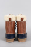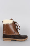 These shearling cuff ankle boots feature a combination of vegan leather/PVC upper, decorative ridges across the front, contrast stitching accents, and low heel. Finished with cushioned insole, soft interior lining, and lace up front closure.