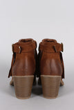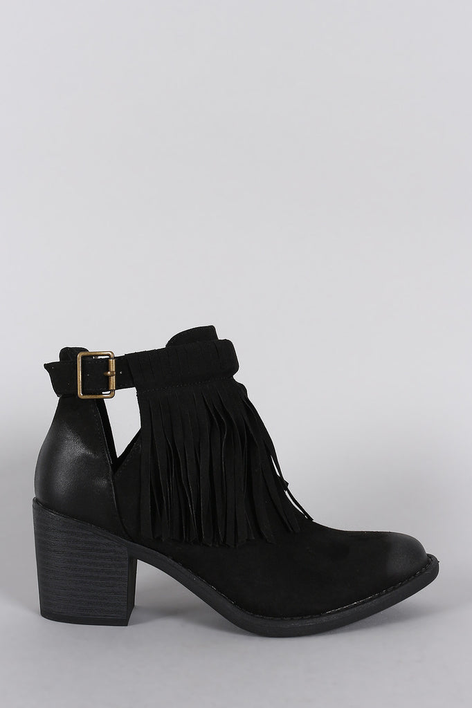 These bohemian chic booties feature an almond toe silhouette, side cutout design with adjustable buckle strap closure, long fringe detail at front, and chunky stacked heel. Finished with cushioned insole for all day comfort.