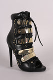 These stylish booties feature a peep toe silhouette, lace up construction, decorative metallic shield straps, and wrapped stiletto heel. Finished with cushioned insole and side zipper closure for easy on/off.