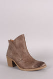 These cowgirl booties feature an almond toe silhouette, oiled vegan suede upper with a burnished finish, asymmetrical collar, and chunky stacked heel. Finished with cushioned insole, smooth lining, and back-zip closure.