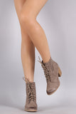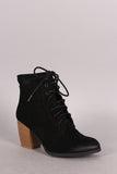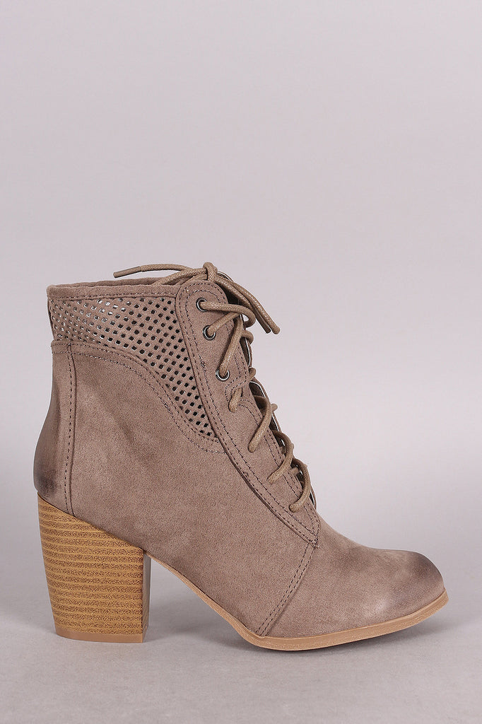 These combat style, featuring a lace up vamp, stitching details, and burnished details. Designed with perforated side details. Finished on a chunky stacked heel.