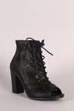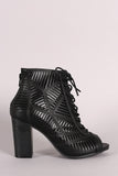 These booties feature a laser cutout pattern, caged construction, peep toe silhouette, lace up front, and chunky stacked heel. Finished with a padded insole and rear zip-up closure.
