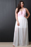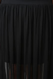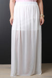 This plus size goddess maxi skirt features a mini skirt with a chiffon maxi skirt overlay. Finished with a wide elasticized waistband. Accessories sold separately. 93% Polyester. 7% Spandex.