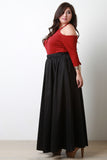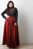 This plus size maxi skirt features a fitted waistband with cinched detail, taffeta knit fabrication, and maxi-length hemline. Accessories sold separately. 55% Polyester, 40% Nylon, 5% Spandex.
