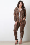This fierce plus size jumpsuit features cheetah pattern print design, zipper front, hoodie back, long sleeves, kangaroo pockets, and jogger cut legs. Accessories sold separately. Made in U.S.A. 95% Cotton, 5% Spandex.