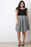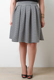 This plus size skirt features a modern stripe print throughout, pleated high waist design, smooth thick knit fabrication, and midi length hemline. Accessories sold separately. 96% Polyester, 4% Spandex.
