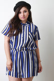 This plus size striped chiffon knit fabrication, pointed collar with button-up front, left chest pocket, short sleeve design, cinched waist, and shorts bottom half. Partially lined. Accessories sold separately. 100% Polyester.