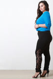 These high waisted leggings features an elasticized waist, beautiful lace inset, stretchy sculpture fit, and taper cut legs. Accessories sold separately. Made in U.S.A. Self: 95% Polyester, 5% Spandex. Lace 90% Nylon, 10% Spandex.