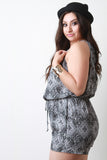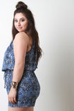 This chic plus size romper features a lightweight woven fabrication, adjustable self tie spaghetti straps, back keyhole, elastic waist, faux drawstring, and a loose fit short. Accessories sold separately. Made in U.S.A. 98% Polyester, 2% Spandex.