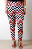 These plus size leggings feature a silky stretchy knit fabrication, multicolored zigzag print pattern, elasticized waist band, and finished with taper cut legs. Accessories sold separately. Made in U.S.A. 95% Polyester, 5% Spandex.